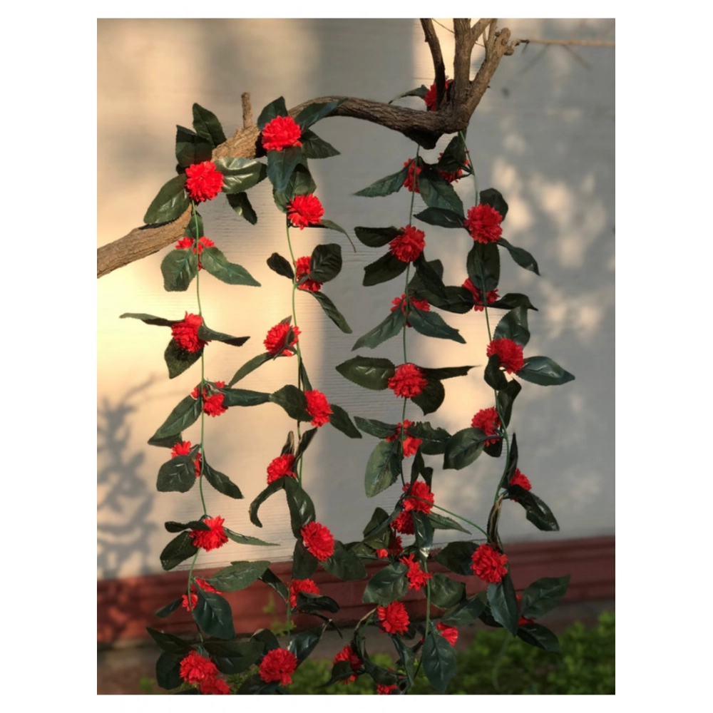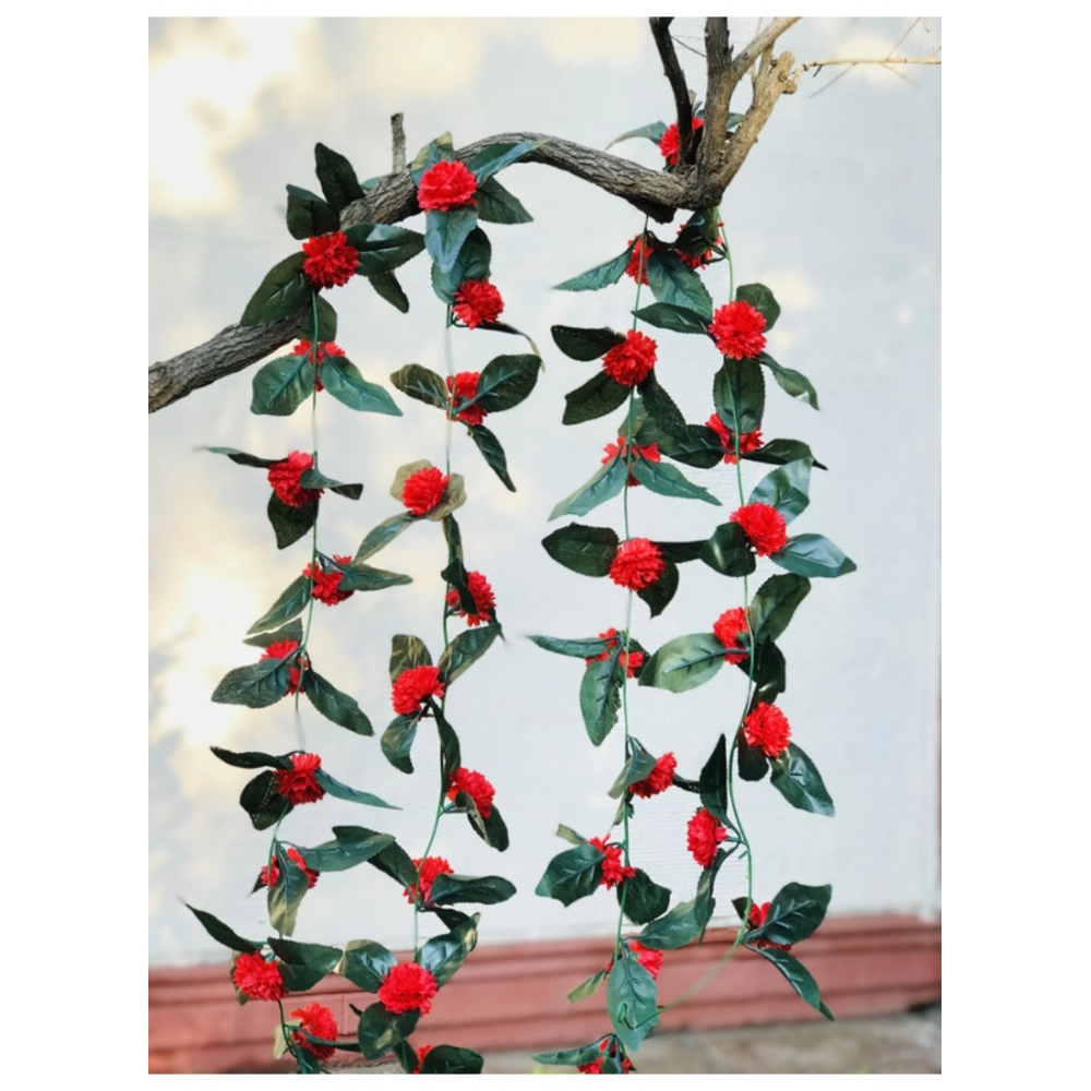 Artificial Red Marigold Genda Flower Vine Creeper With Big Green Leaves For Home Decoration