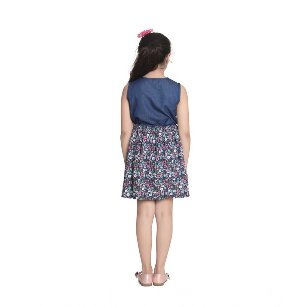 Girl’s Denim-Rayon Floral Printed Sleeveless Round Neck Dress
