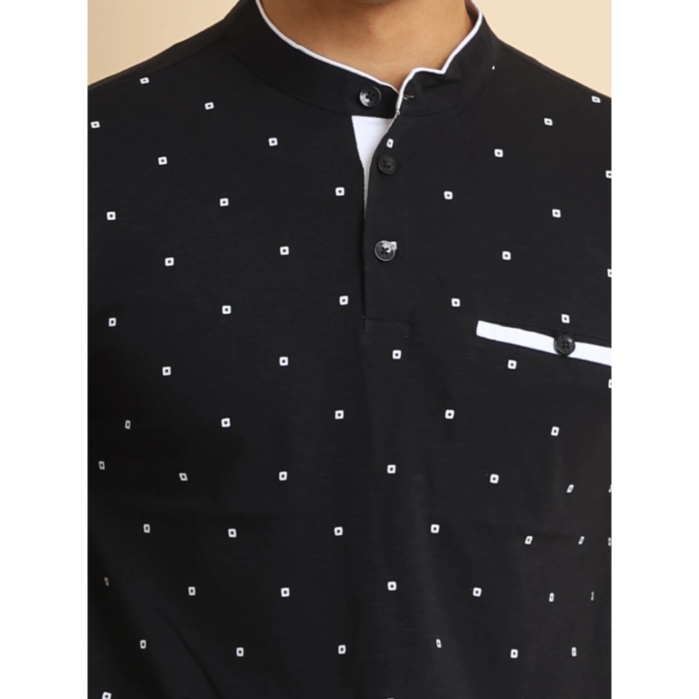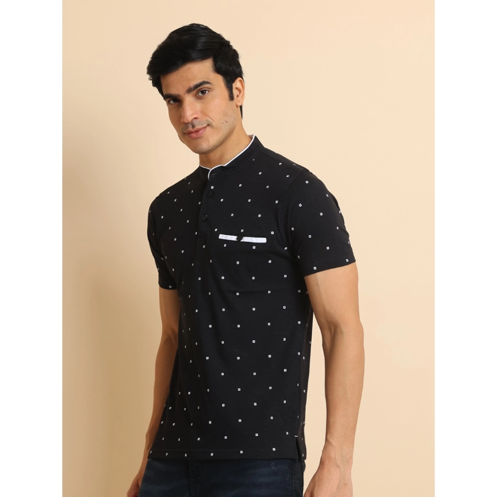 Men’s Casual Cotton Printed Mandarin Collar Half Sleeve T-Shirt (Black)
