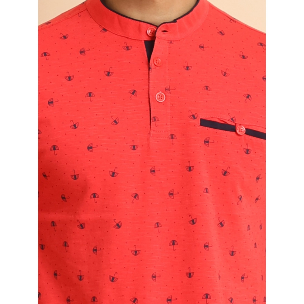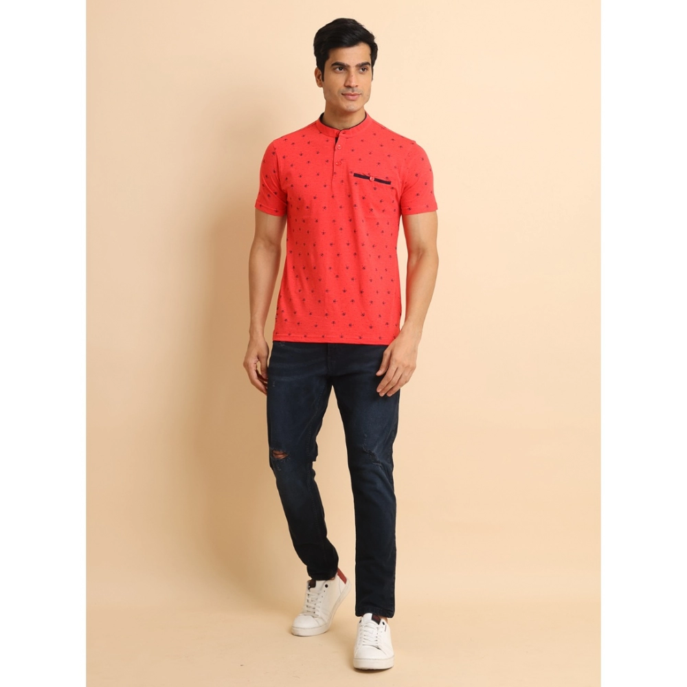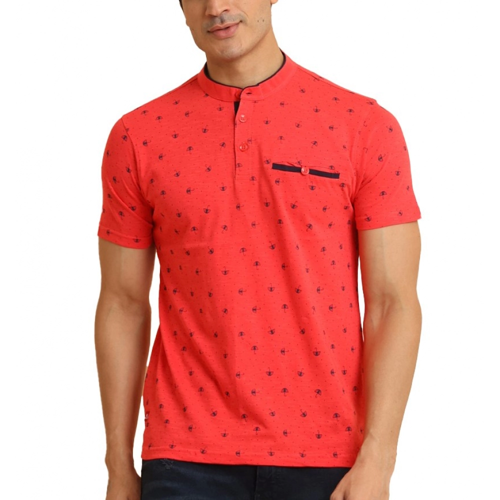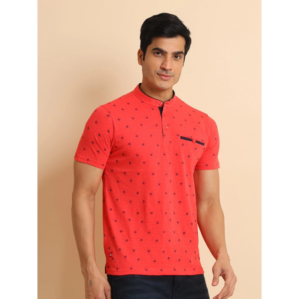 Men’s Casual Cotton Printed Mandarin Collar Half Sleeve T-Shirt (Red)
