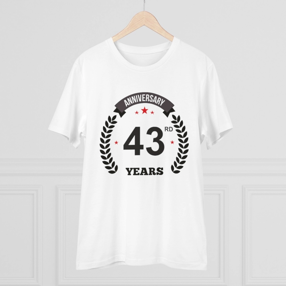 Be the first to review “Men’s PC Cotton 43rd Anniversary Printed T Shirt (Color: White, Thread Count: 180GSM)”