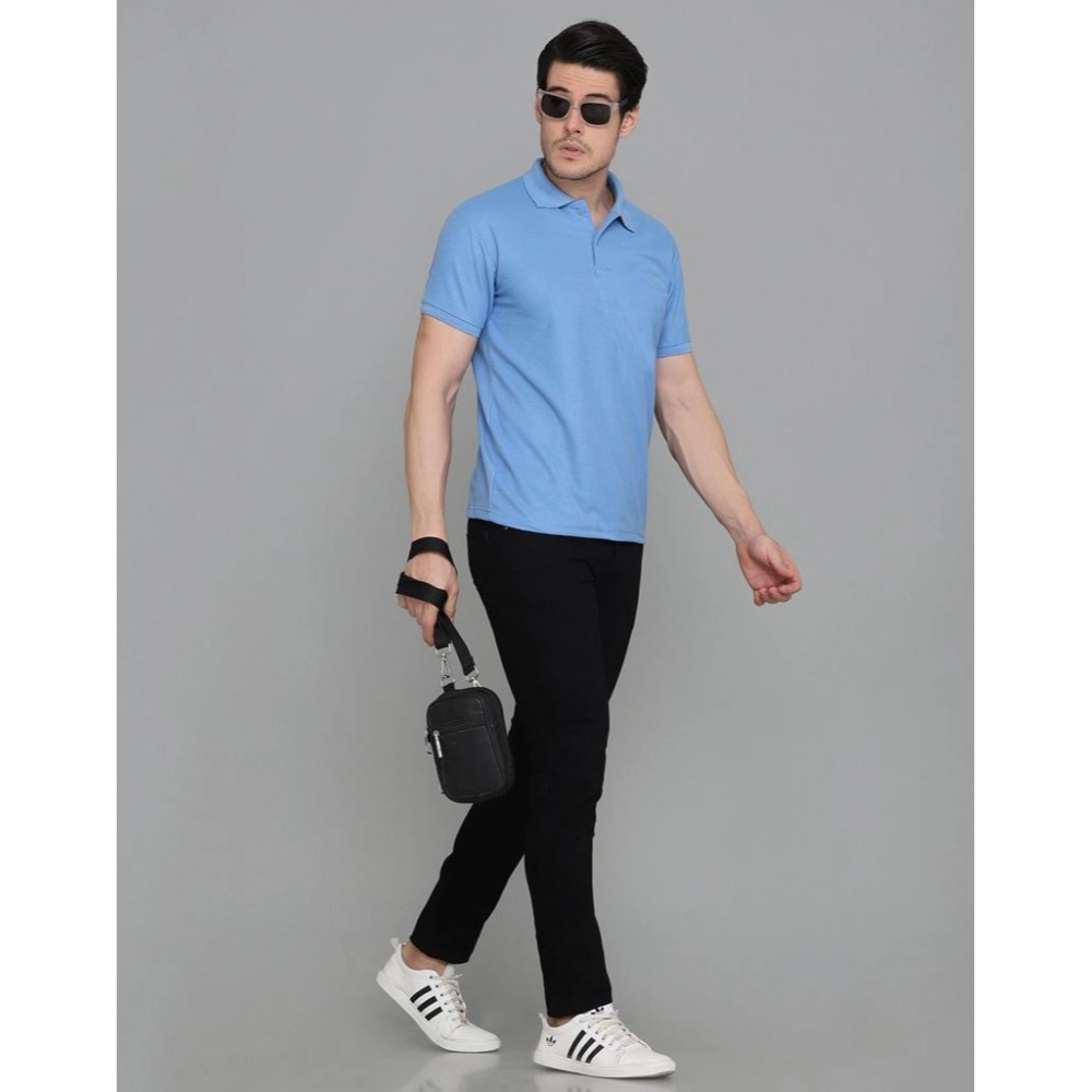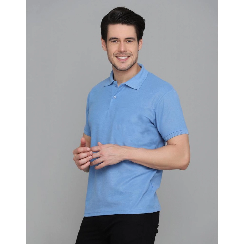 Men’s?Casual Half Sleeve Solid Cotton Blended Polo Neck T-shirt (Blue)