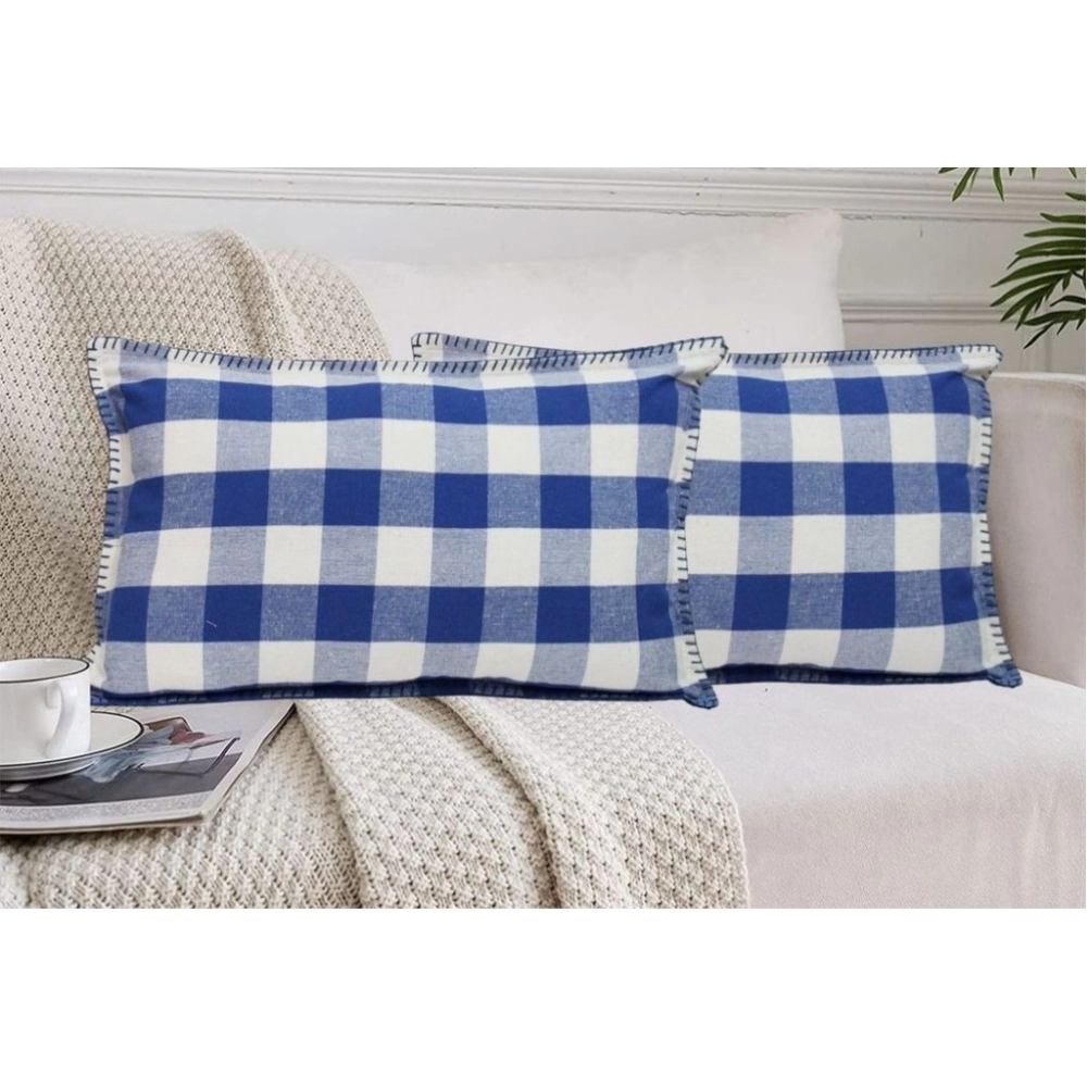 Pack Of_2 Cotton Checkered Cushion Cover With Blanket Stitch (Blue, Size: 12×20 In)