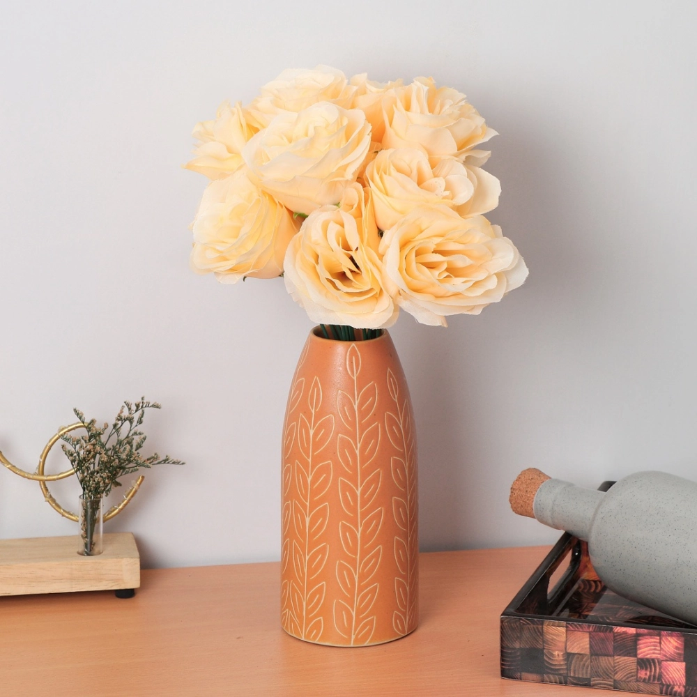 Silk Polyester Artificial Rose Flowers Bunch Bouquet Of 12 Roses For Home Decoration (Color: Cream,Length: 17 Inches)