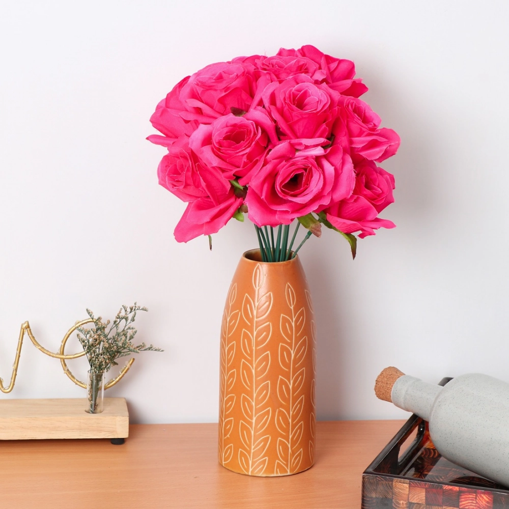 Silk Polyester Artificial Rose Flowers Bunch Bouquet Of 12 Roses For Home Decoration (Color: Pink,Length: 17 Inches)
