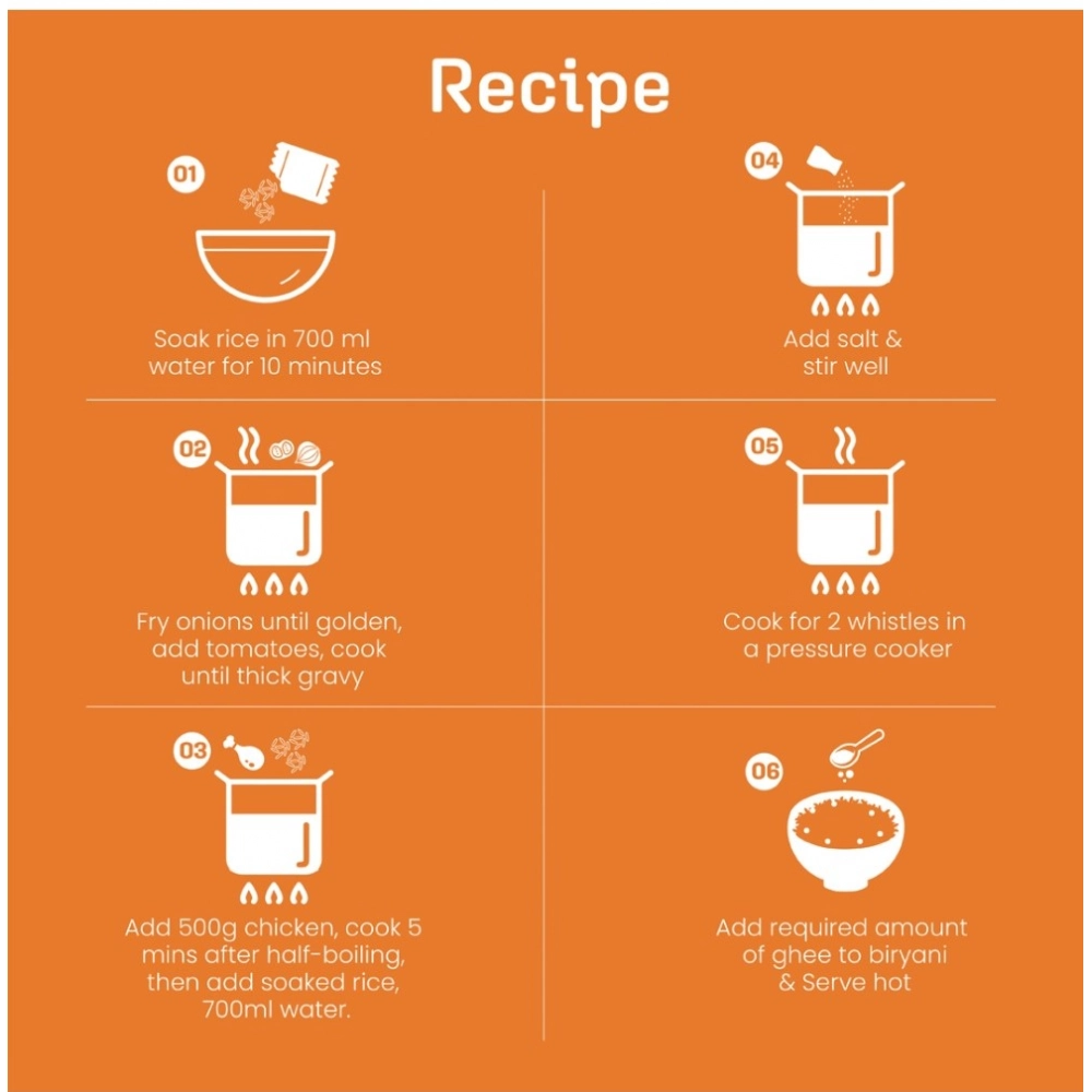 Ingredients: Seera Samba Rice, Kashmiri Chilli, Black Pepper, Salt, Turmeric, Coriander Powder, Onion Powder, Ginger Powder, Garlic Powder, Cassia Powder, Cardmon Powder, Refined Sunflower, Oil,