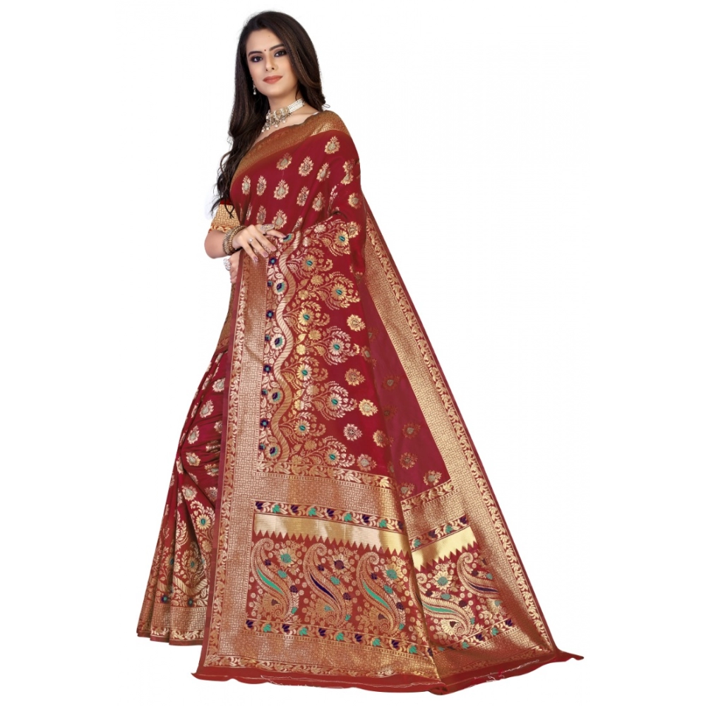 Women’s Banarasi Silk Designer Weaving Saree With Unstitched Blouse (Maroon, 5.50 Mtrs)