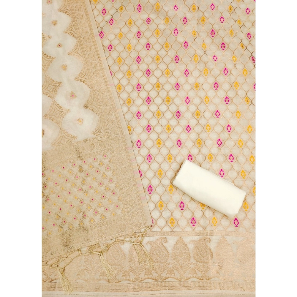 Women’s Banarasi Silk Printed Unstitched Salwar Suit Material With Dupatta (White, 3Mtrs)