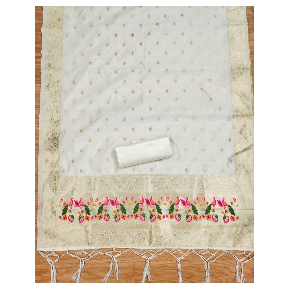 Women’s Banarasi Silk Printed Unstitched Salwar Suit Material With Dupatta (White, 3Mtrs)