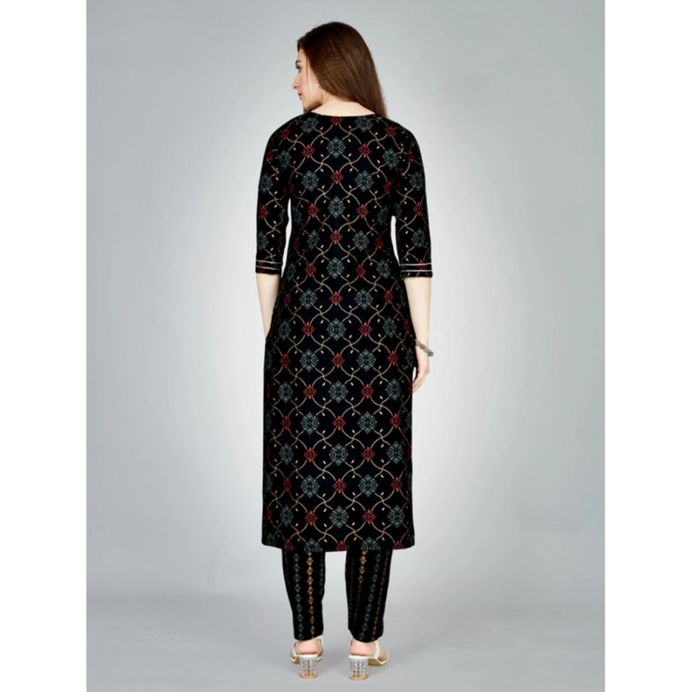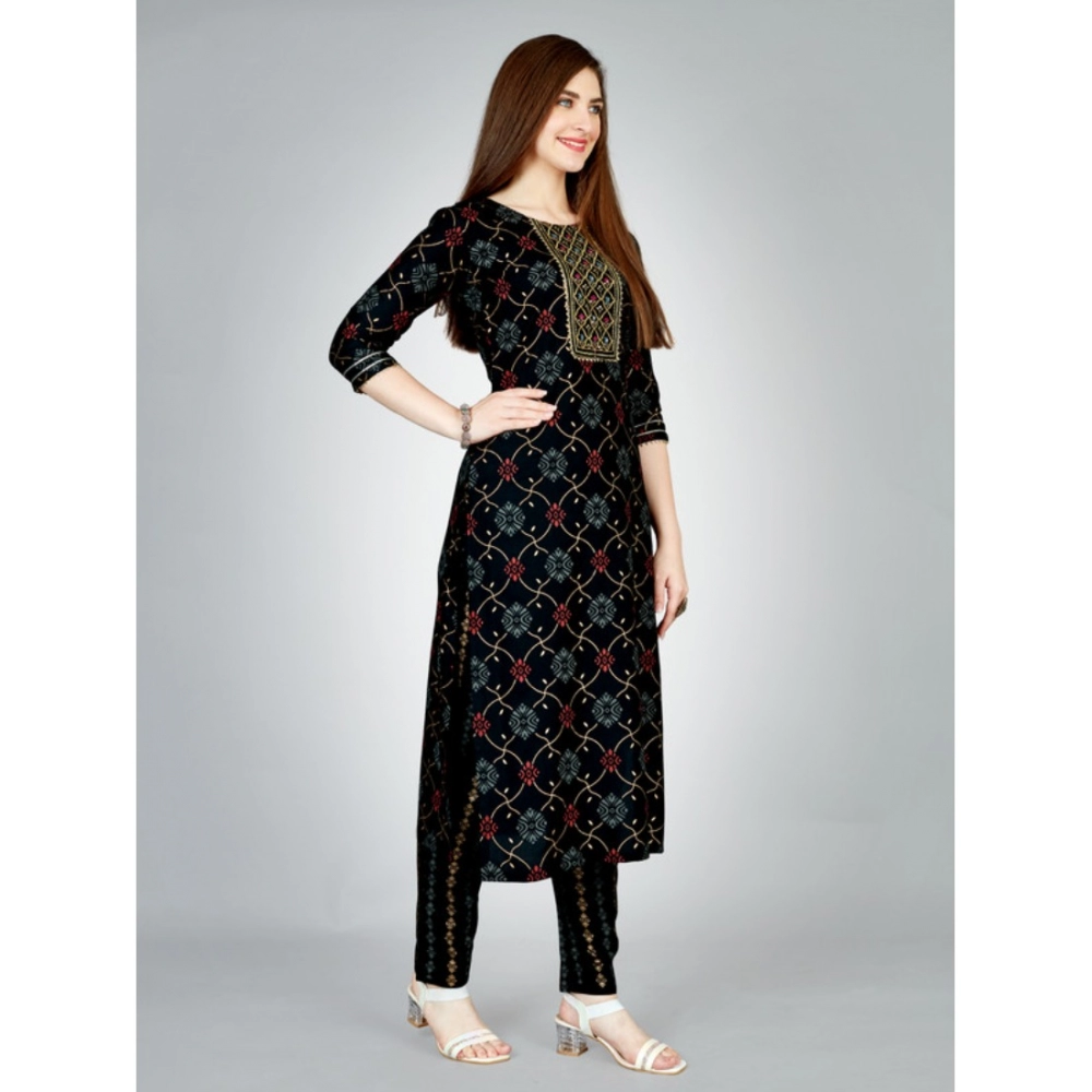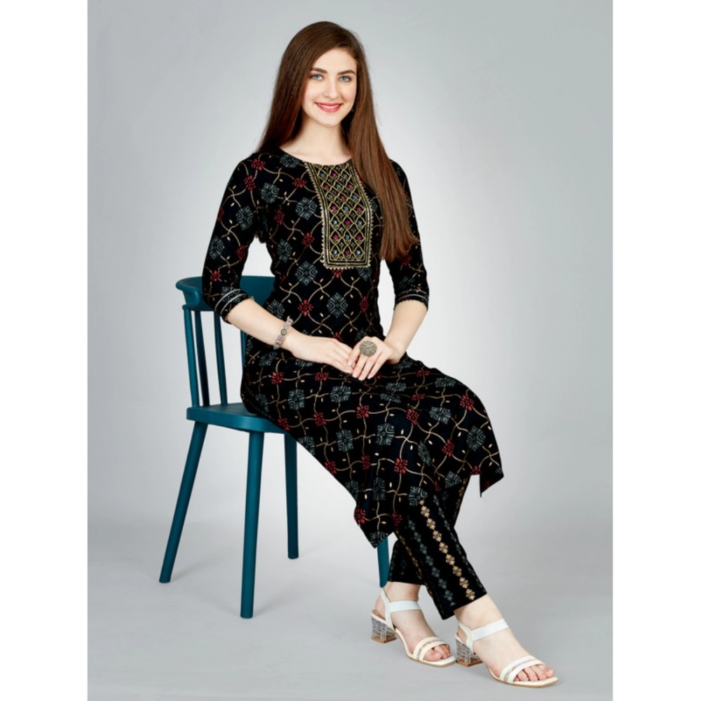 Women’s Casual 3-4 th Sleeve Embroidery Rayon Kurti Pant Set (Black)