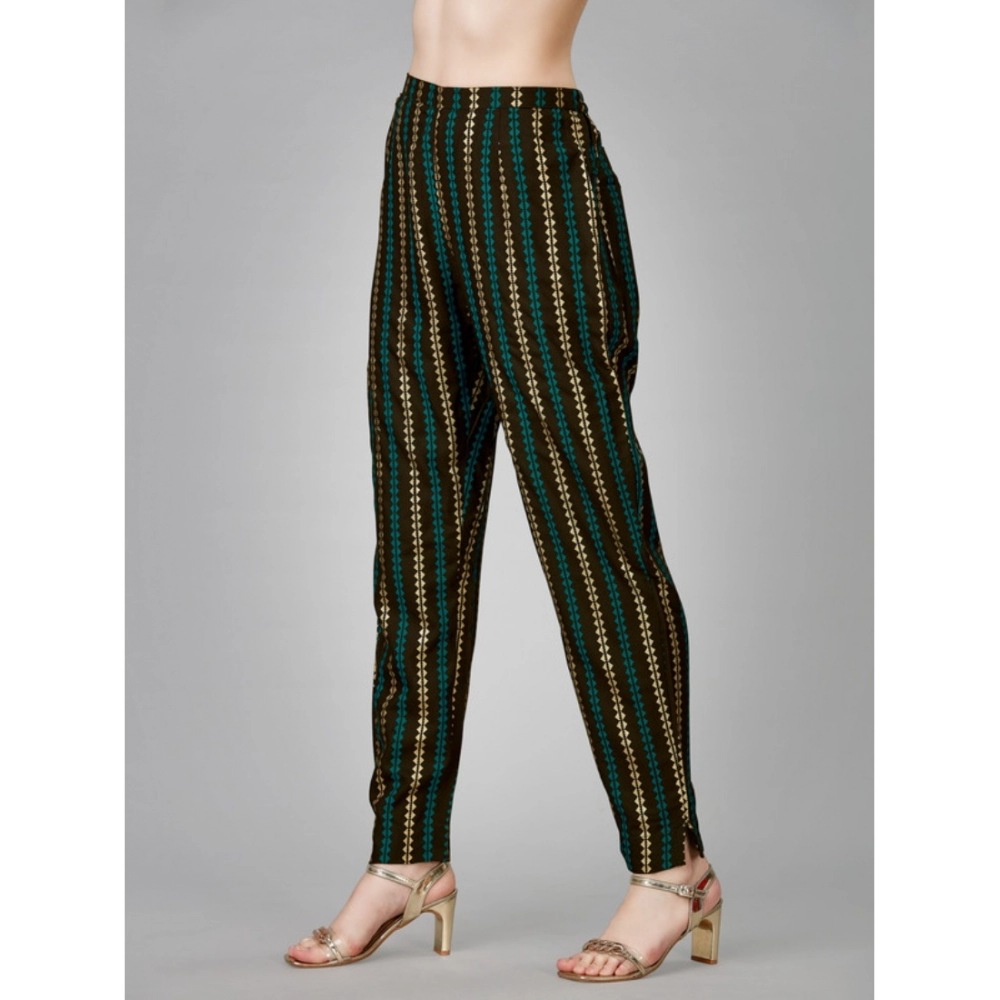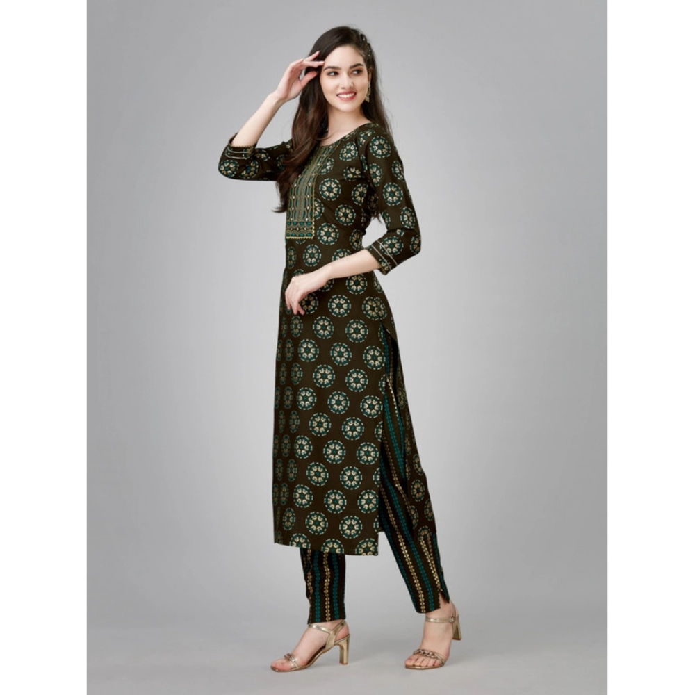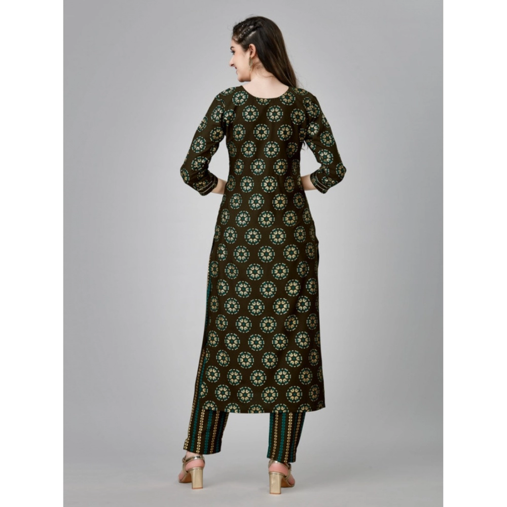 Women’s Casual 3-4 th Sleeve Embroidery Rayon Kurti Pant Set (Brown)