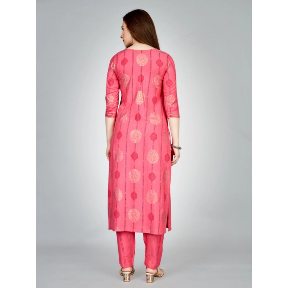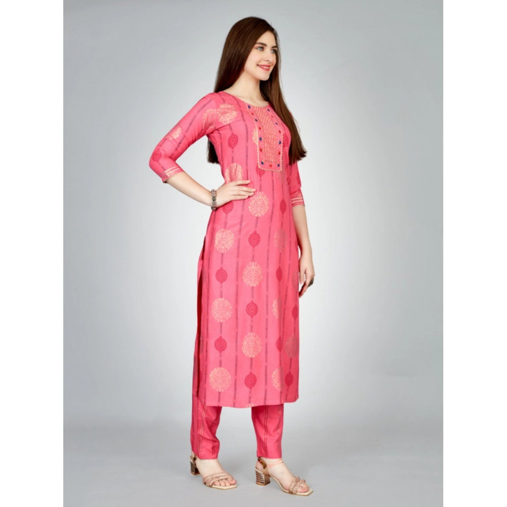 Women’s Casual 3-4 th Sleeve Embroidery Rayon Kurti Pant Set (Pink)