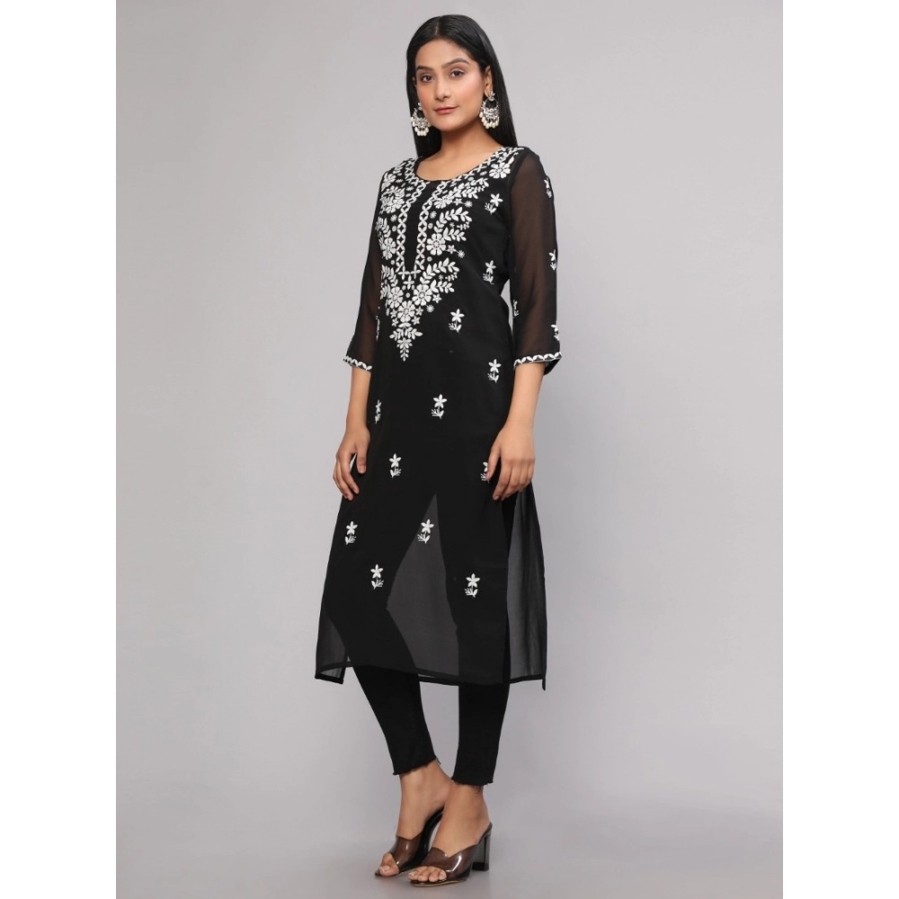 Women’s Casual 3/4th Sleeve Embroidered Georgette Kurti (Black)