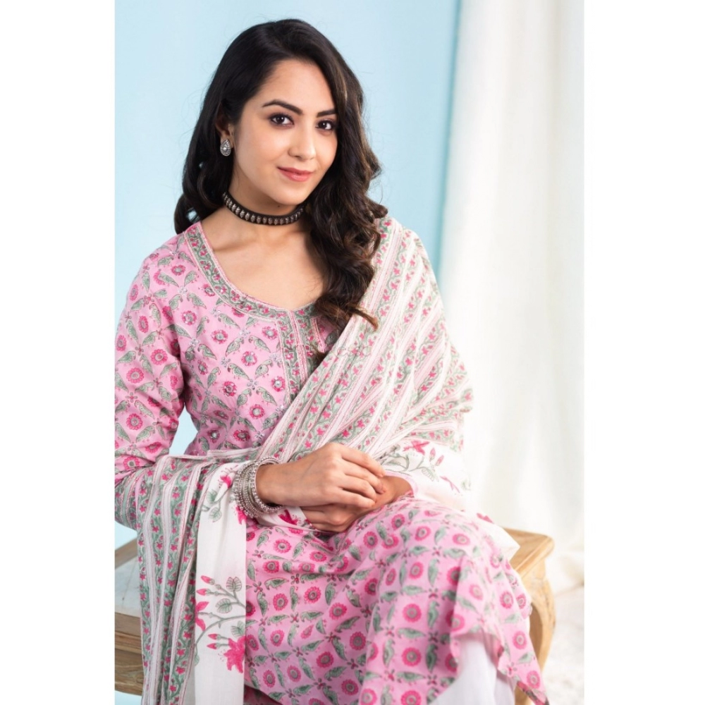 Women’s Casual 3/4th Sleeve Printed Cotton Kurti Set (Pink)