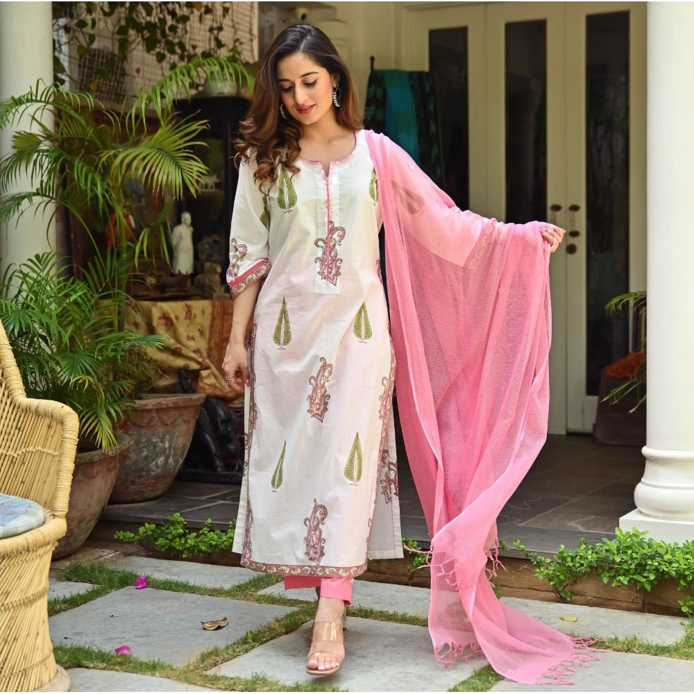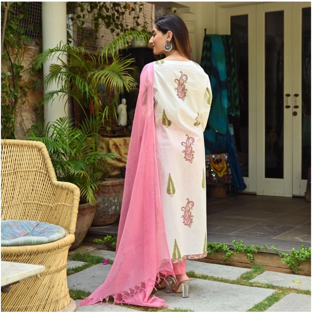 Women’s Casual 3/4th Sleeve Printed Cotton Kurti Set (White)