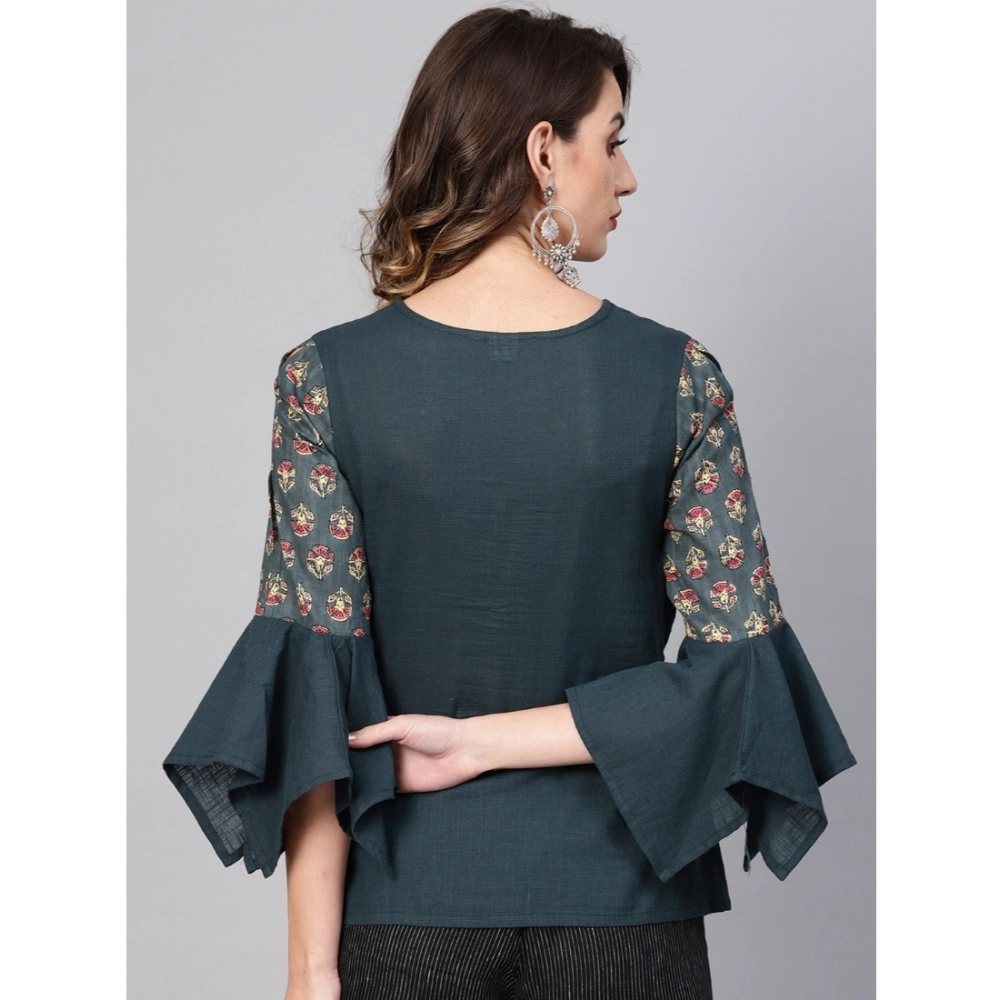 Women’s Casual Bell Sleeves Floral Printed Cotton Slub Top