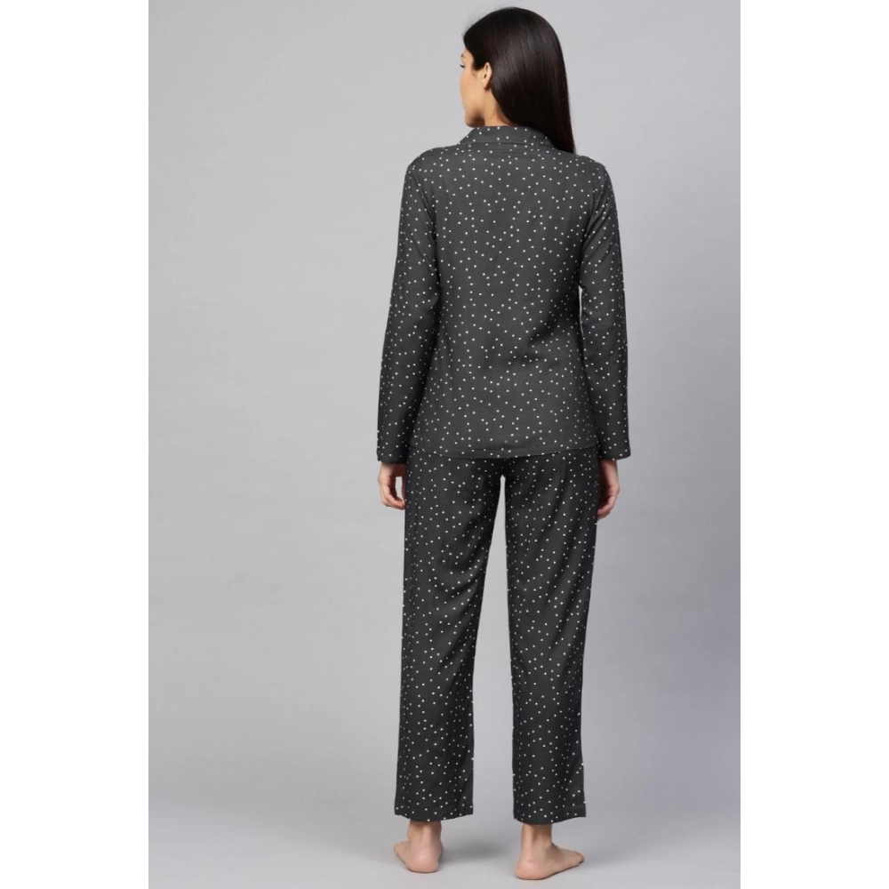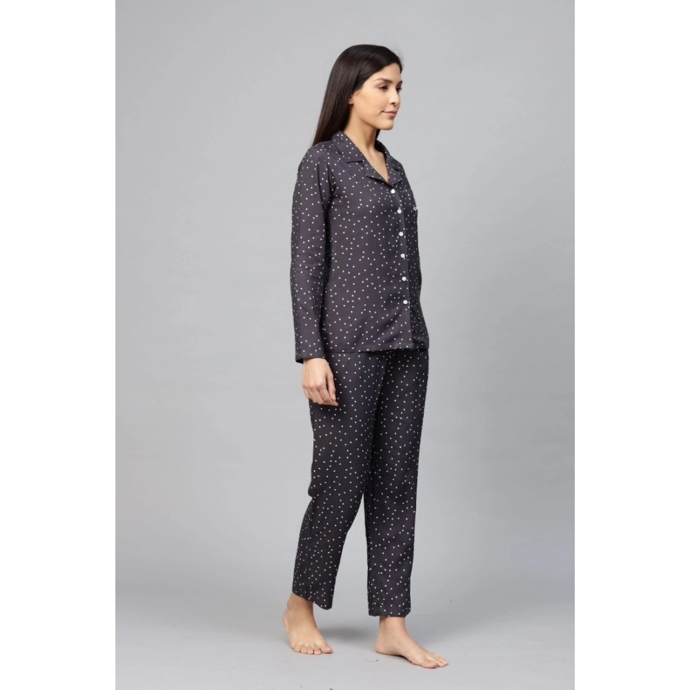 Women’s Casual Full Sleeves Polka Dot Printed Rayon Shirt With Pyjama Pant Night Suit Set (Grey)