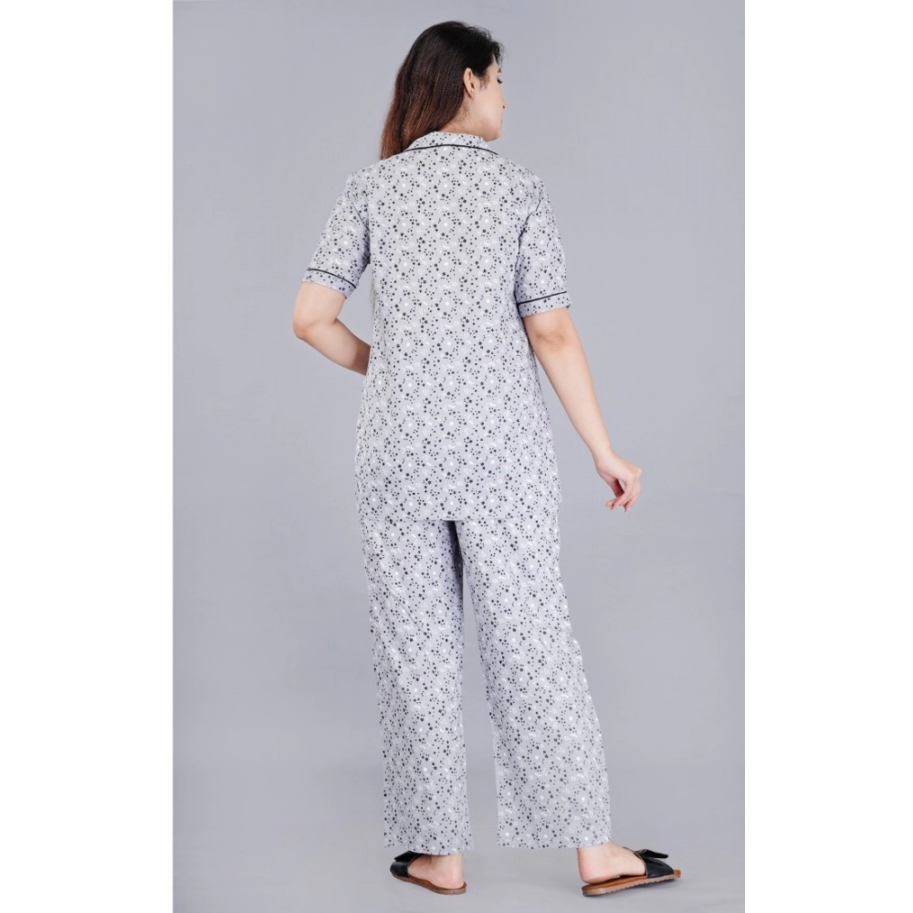 Women’s Casual Half Sleeve Printed Viscose Rayon Shirt With Pyjama Pant Night Suit Set (Grey)