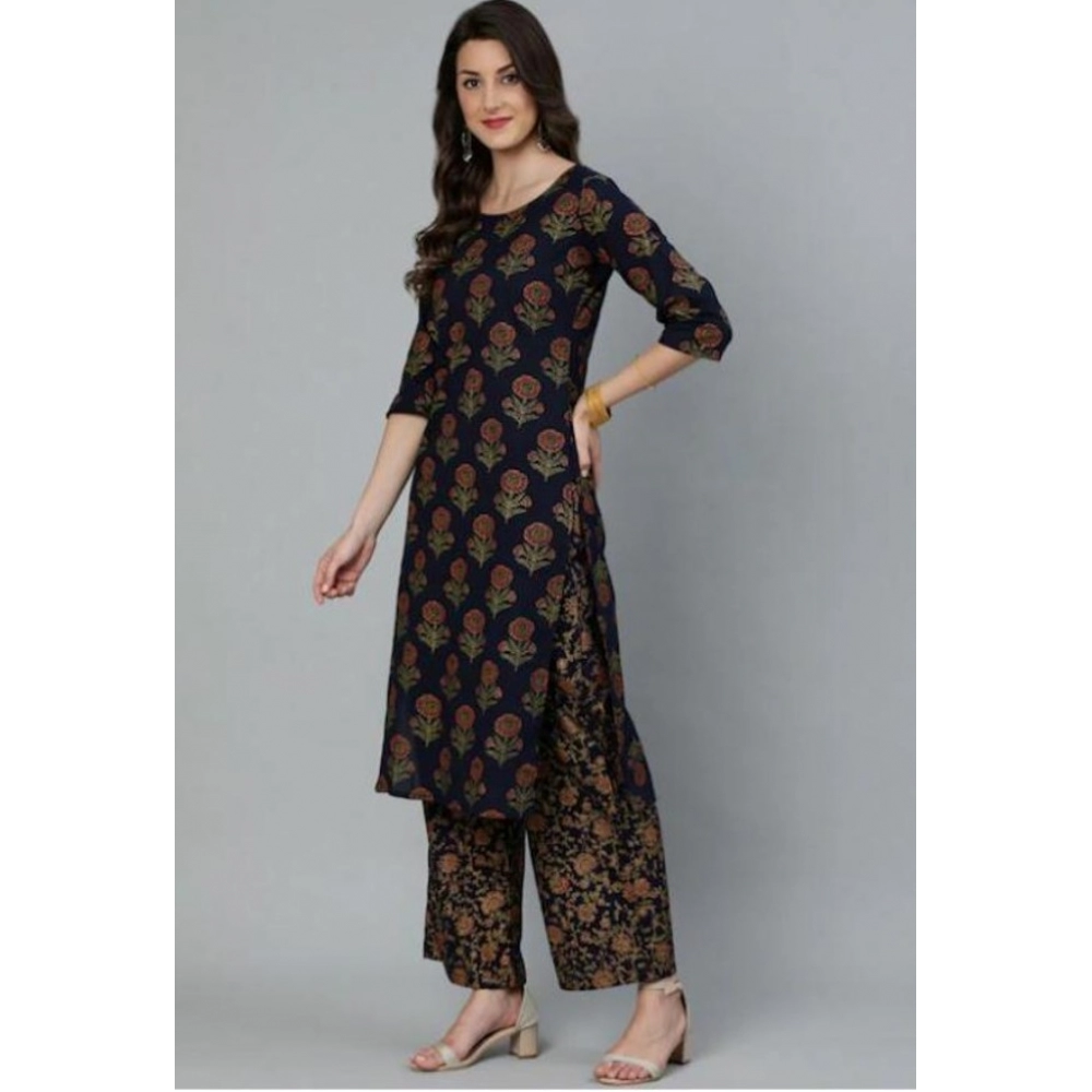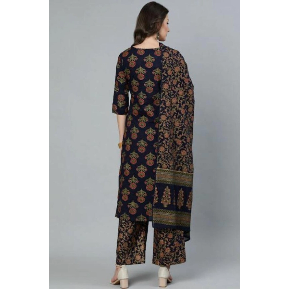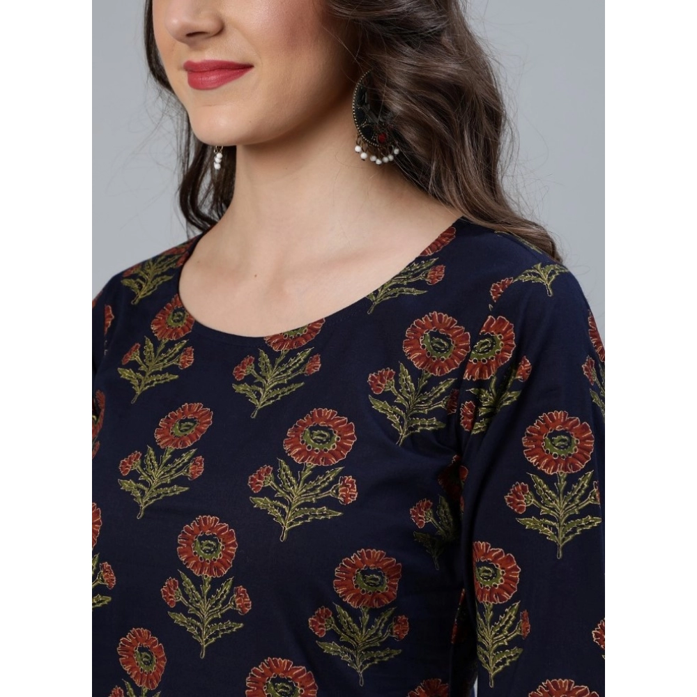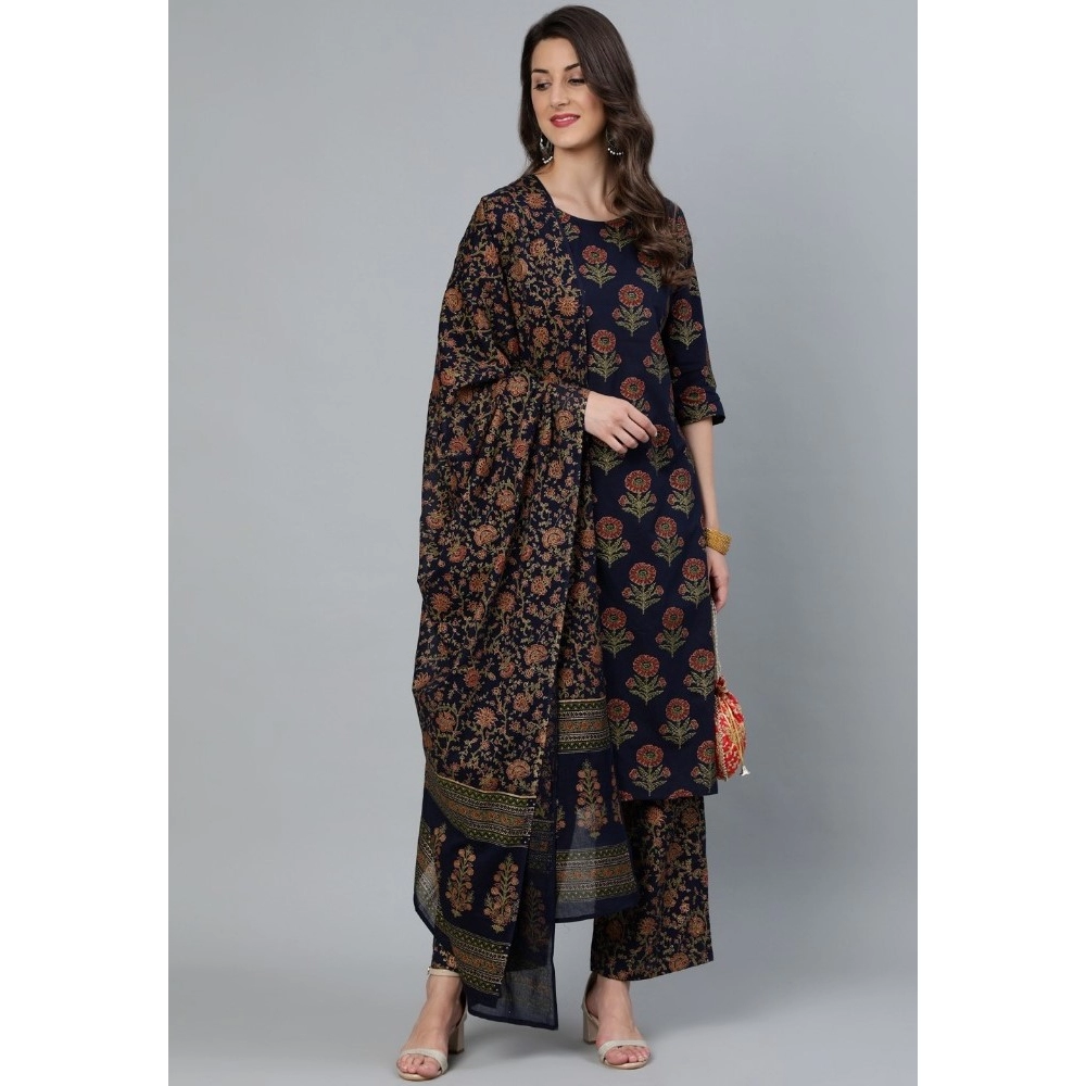 Women’s Cotton Blend Printed Work Kurti With Bottom And Dupatta Set (Navy Blue)