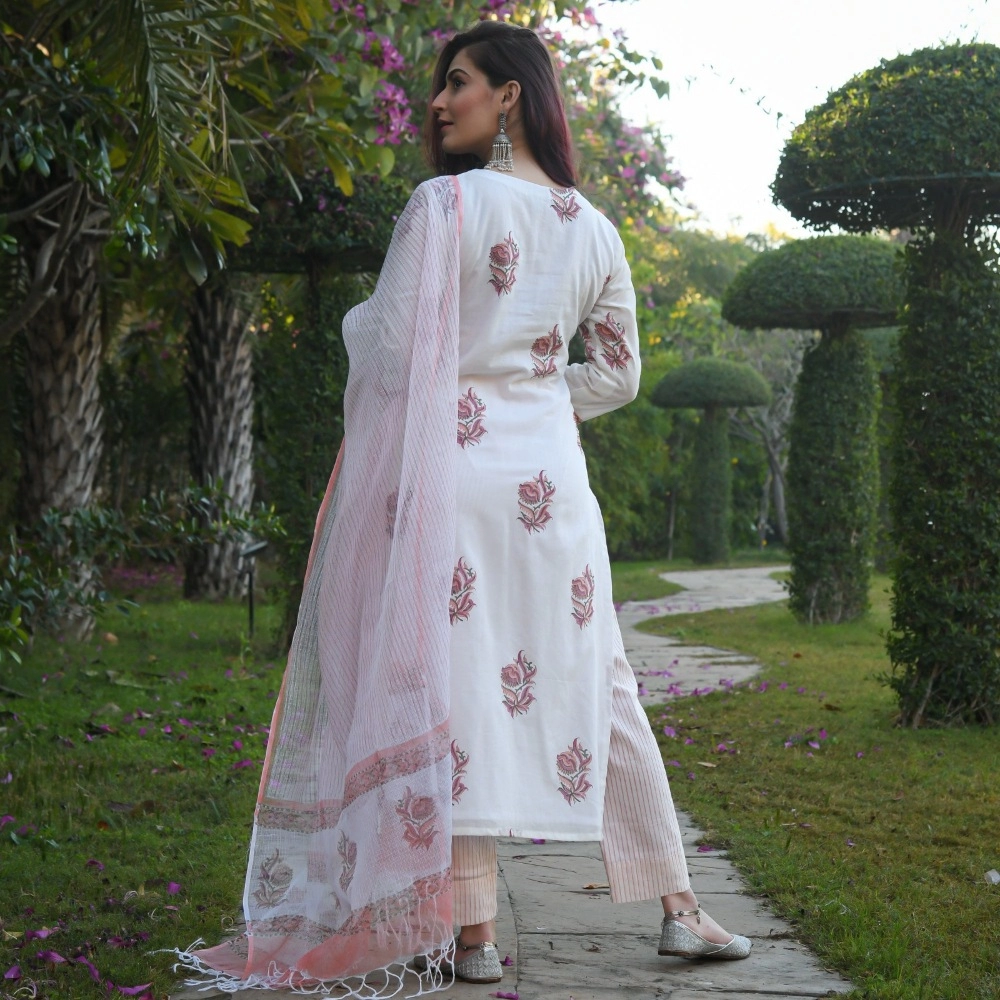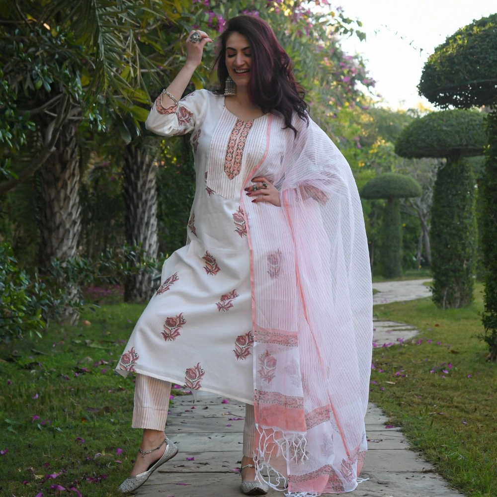 Women’s Cotton Blend Printed Work Kurti With Bottom And Dupatta Set