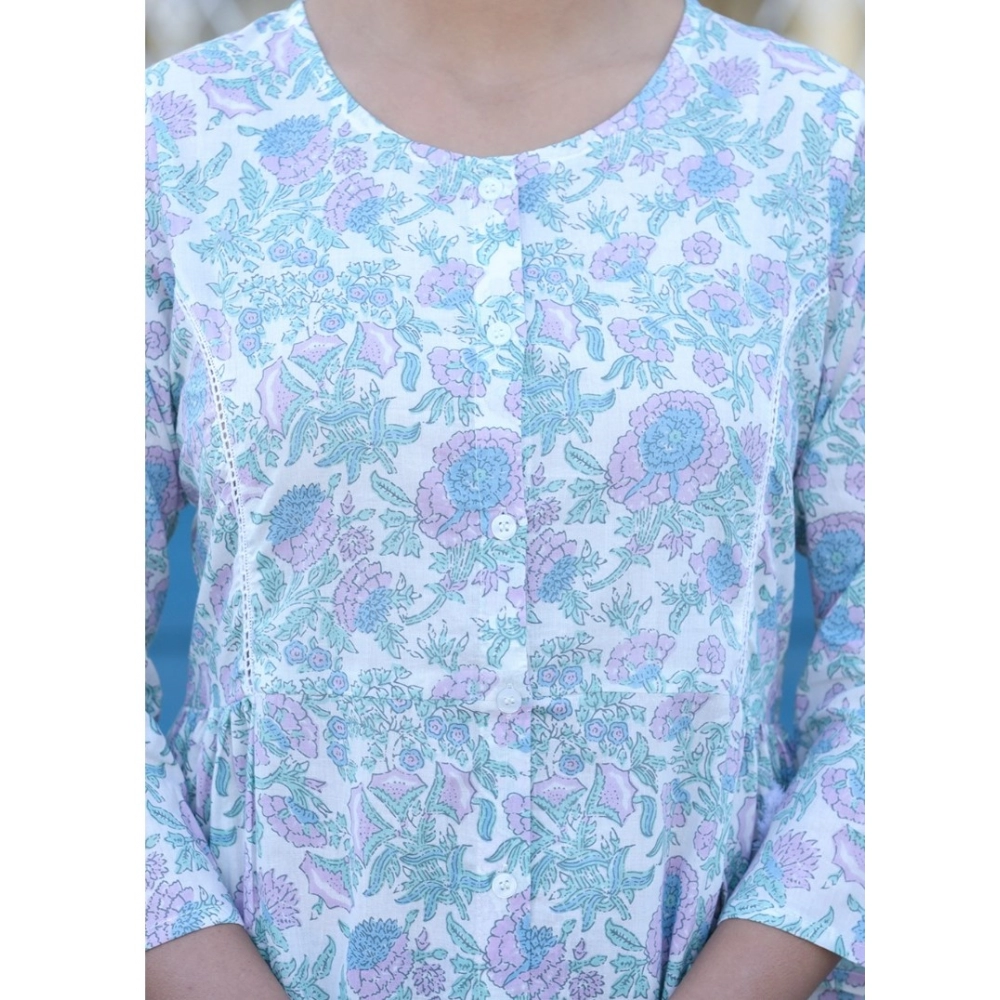 Women’s Cotton Printed 3/4 Sleeve Round Neck Tunics (White-Purple)