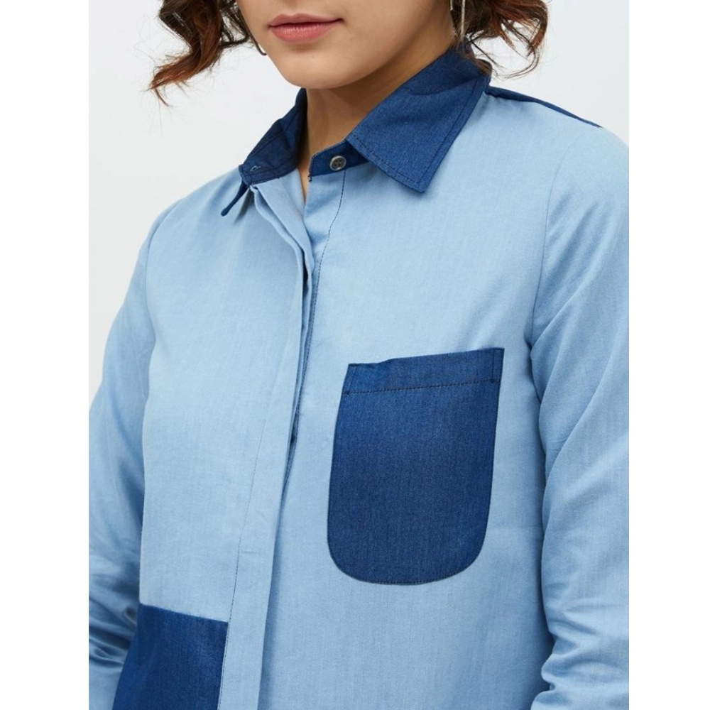 Women’s Denim Patch Work Long Sleeves Standard Length Shirt (Blue)