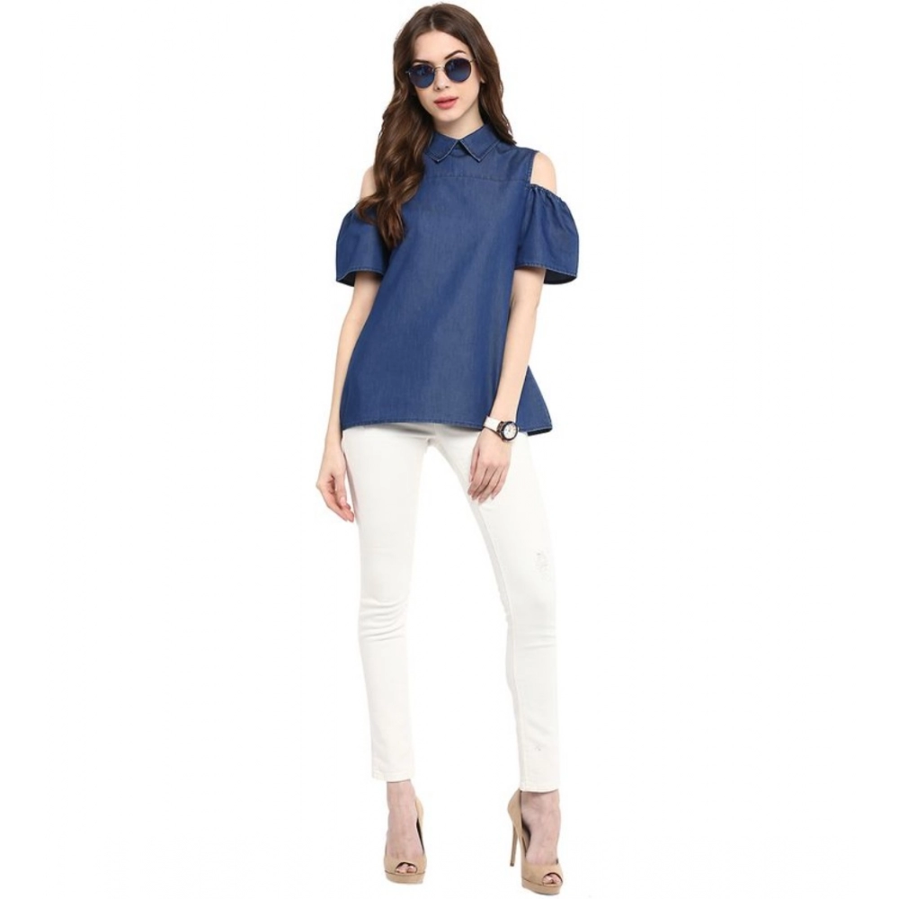 Women’s Denim Solid Cold Shoulder Regular Top (Blue)