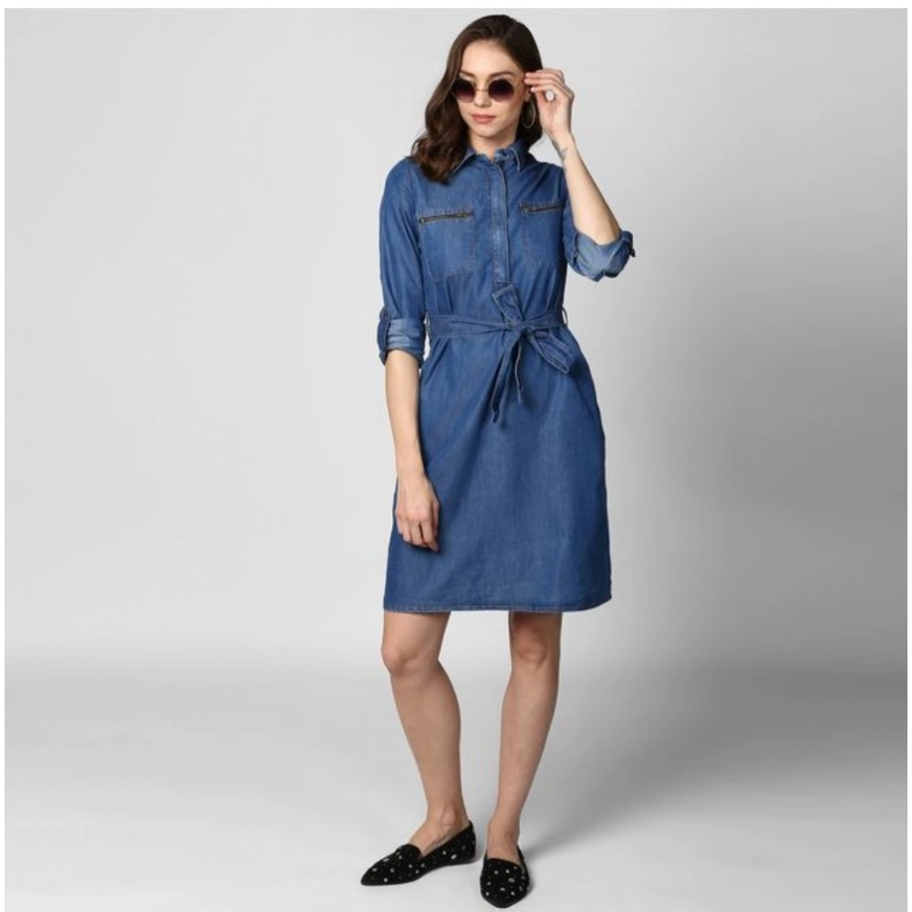 Women’s Denim Solid Collar Neck Roll Up Sleeve Dress