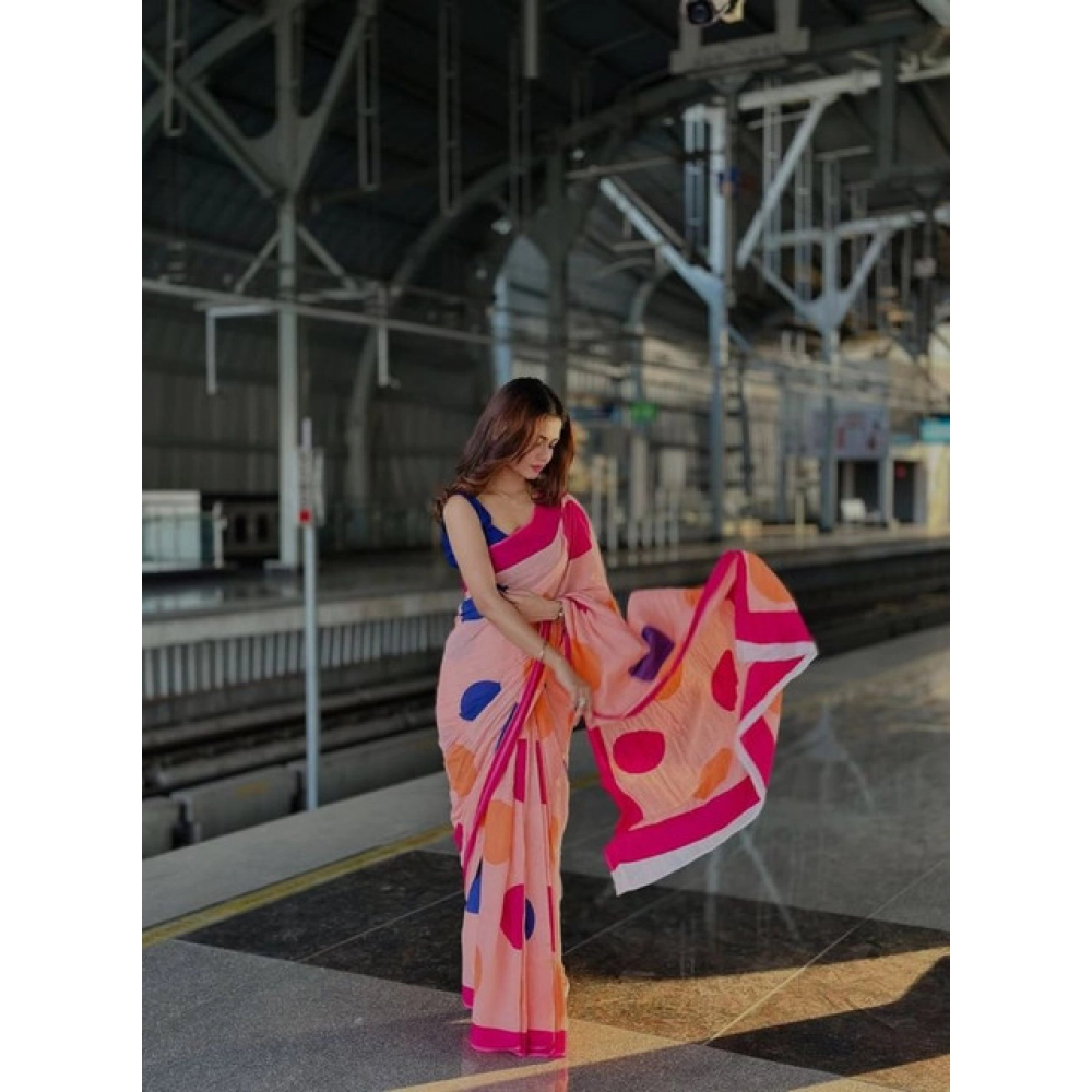 Women’s Linen Printed Saree With Unstitched Blouse 5.5Mtr