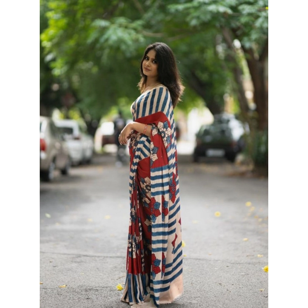 Women’s Linen Printed Saree With Unstitched Blouse 5.5Mtr (Red)
