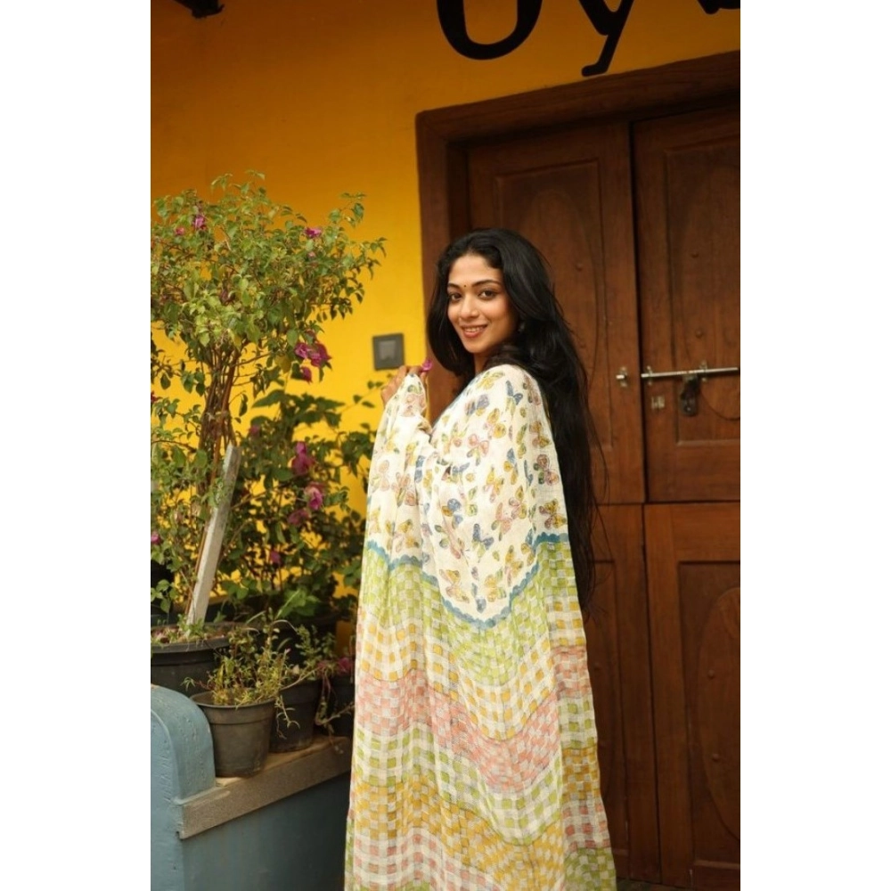 Women’s Linen Printed Saree With Unstitched Blouse 5.5Mtr (White)