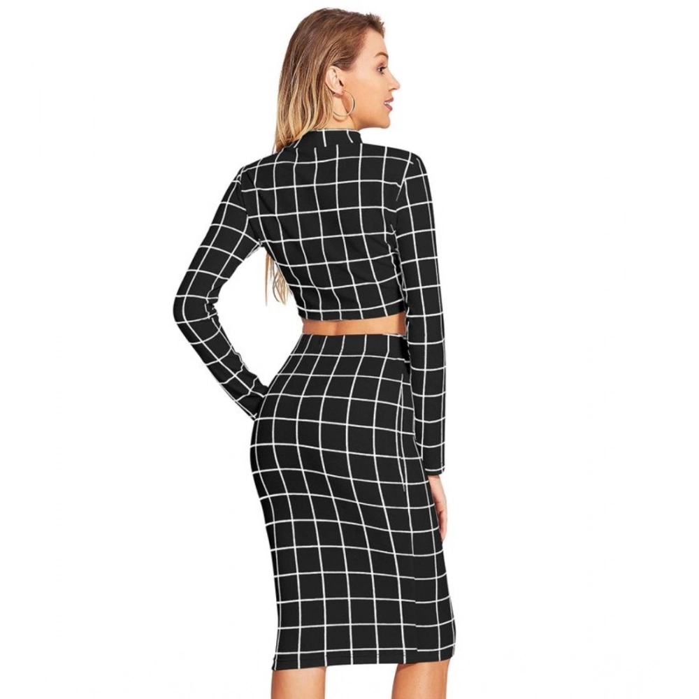 Women’s Polyester Checkered Full Sleeves Stand Collar Crop Top Skirt Set