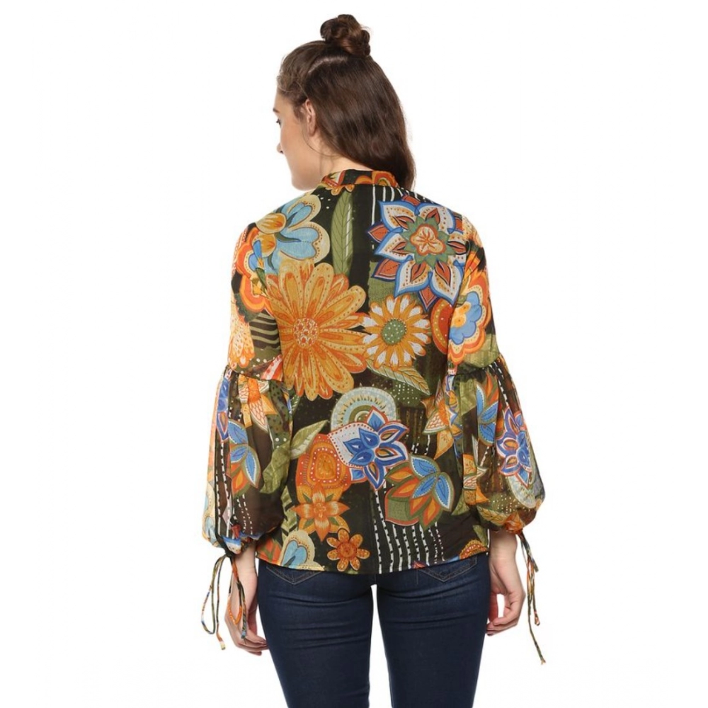 Women’s Polyester Floral Balloon Sleeve Top (Mustard – Olive)