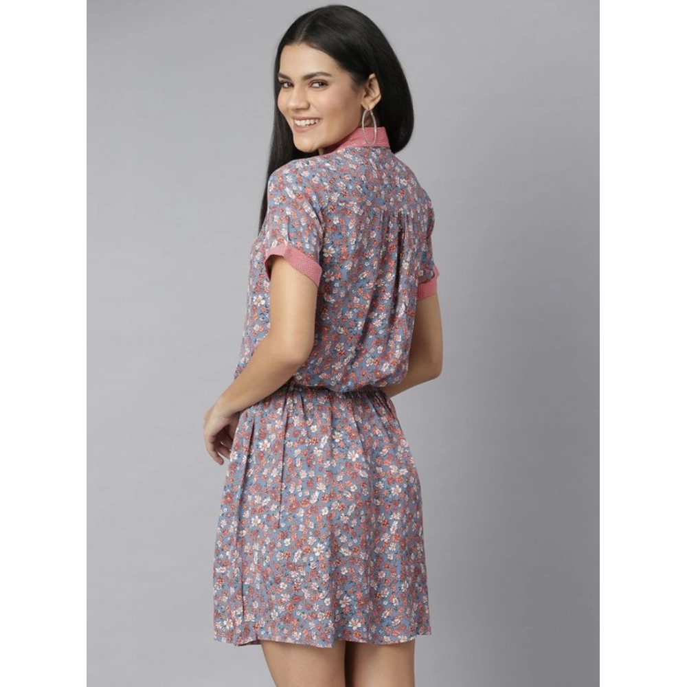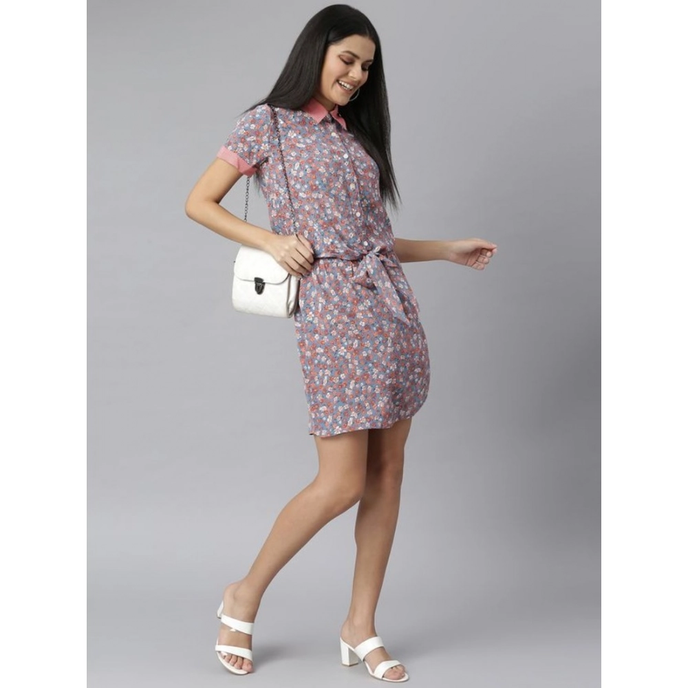 Women’s Polyester Moss Floral Collar Neck Short Sleeve Dress