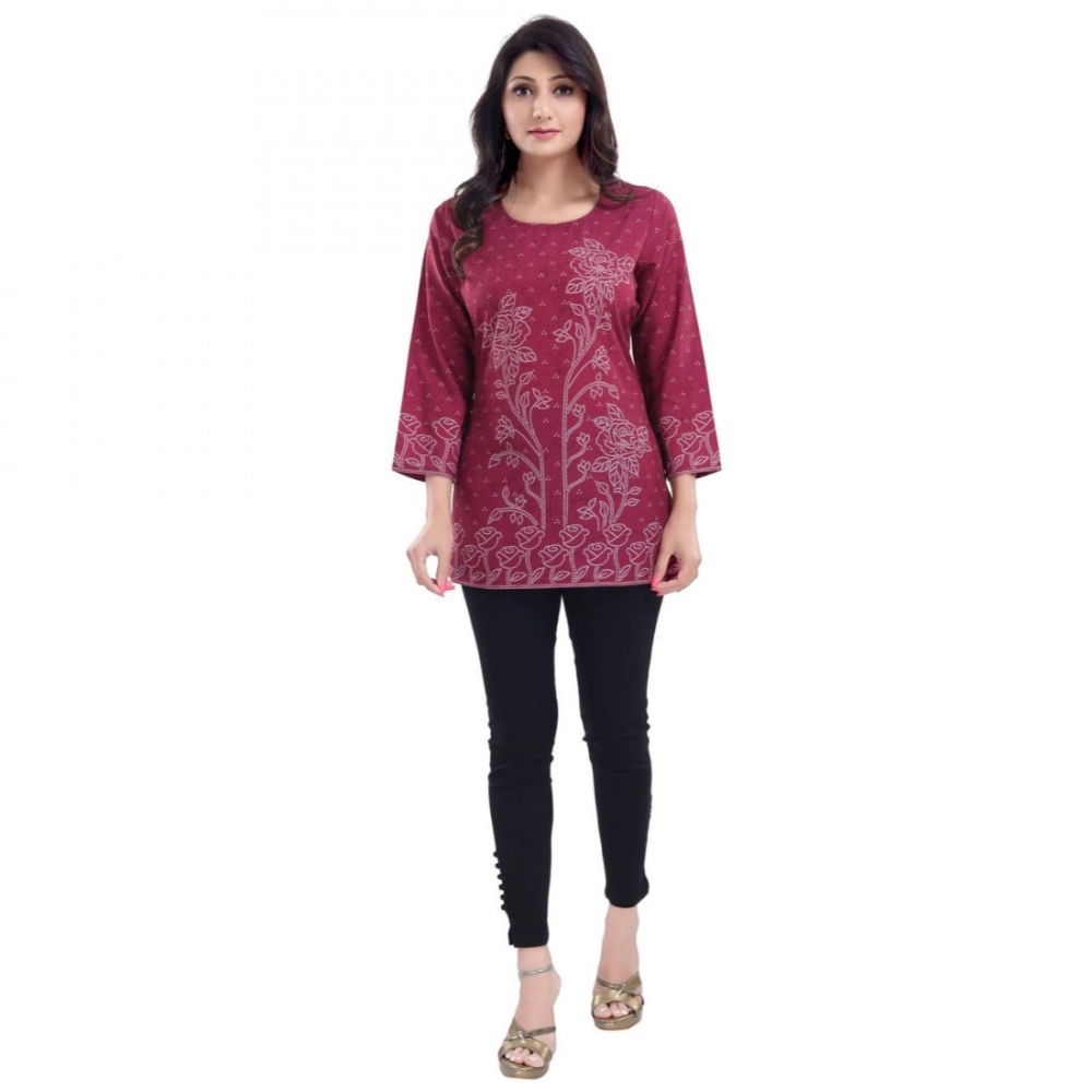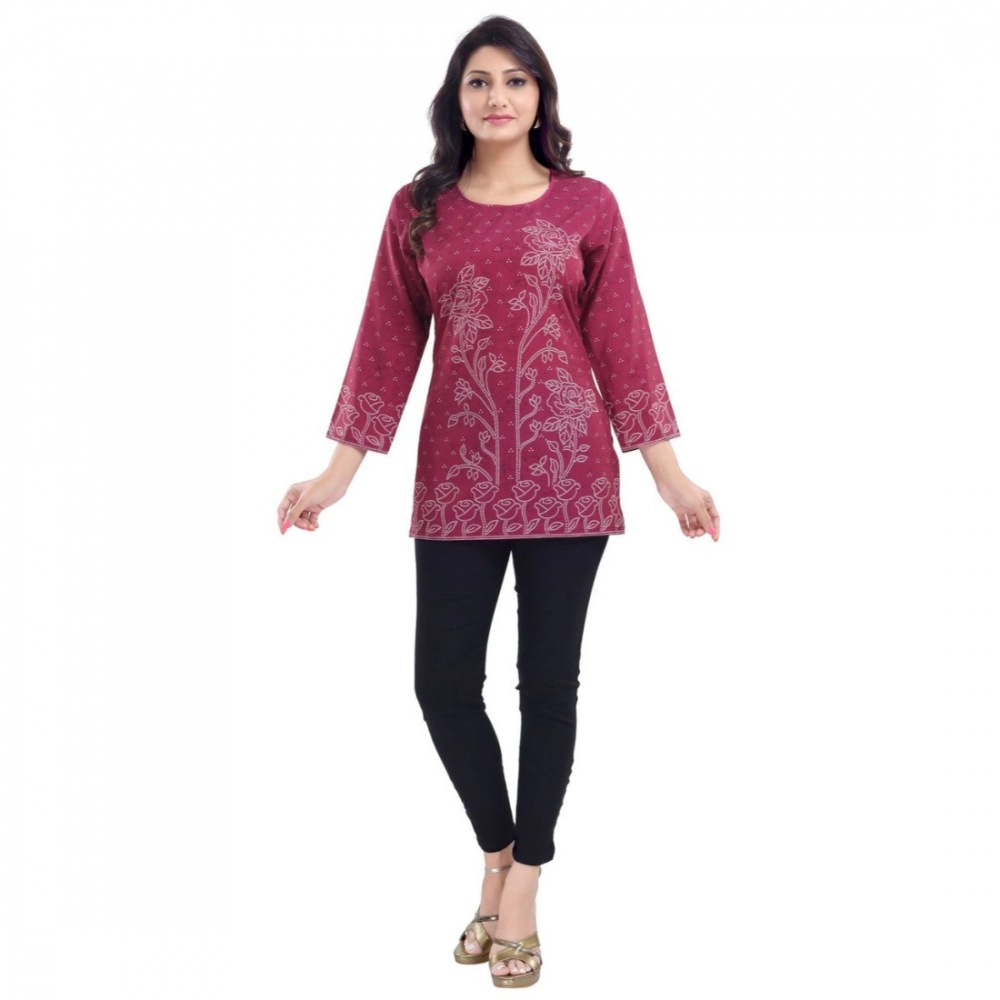 Women’s Quarter Sleeve Faux Crepe Printed Short Kurti Tunic Top (Color:Magenta)