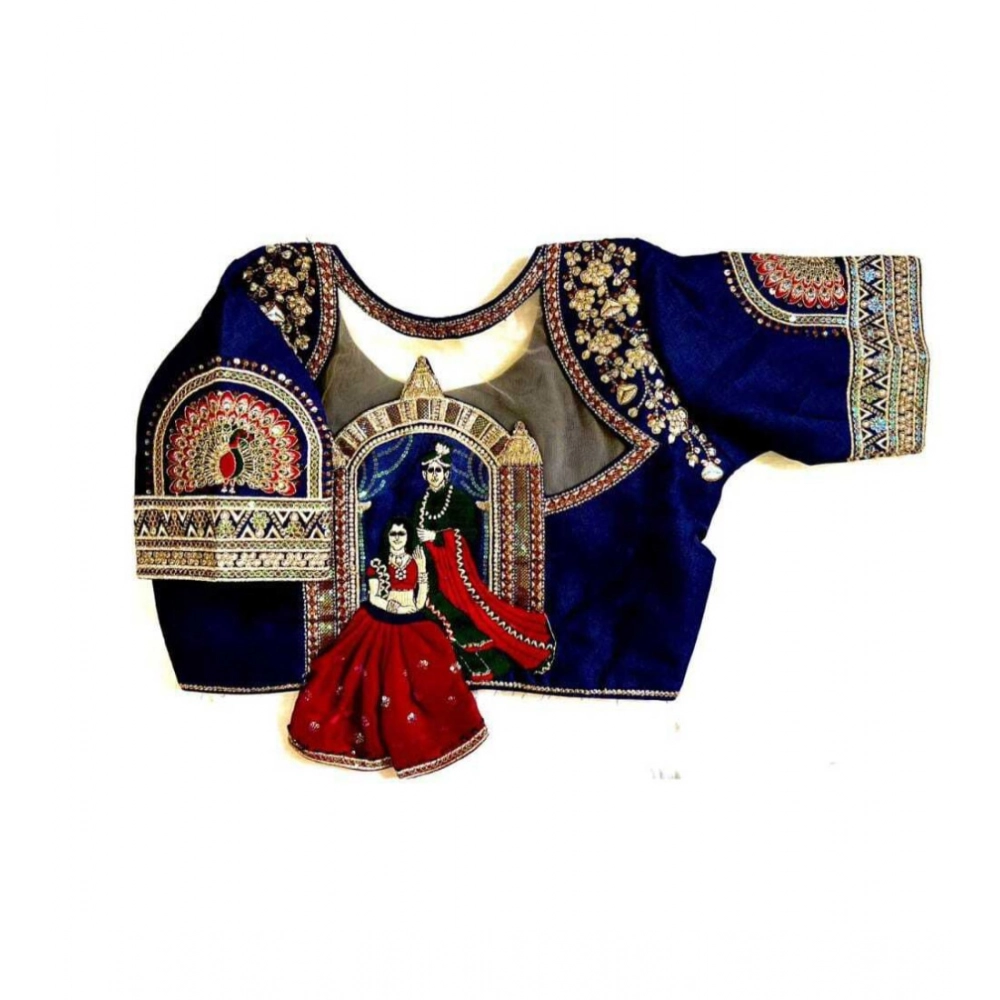 Women’s Shining silk Sequance Round Neck Short Sleeve Readymade Blouse (Blue, Free Size)