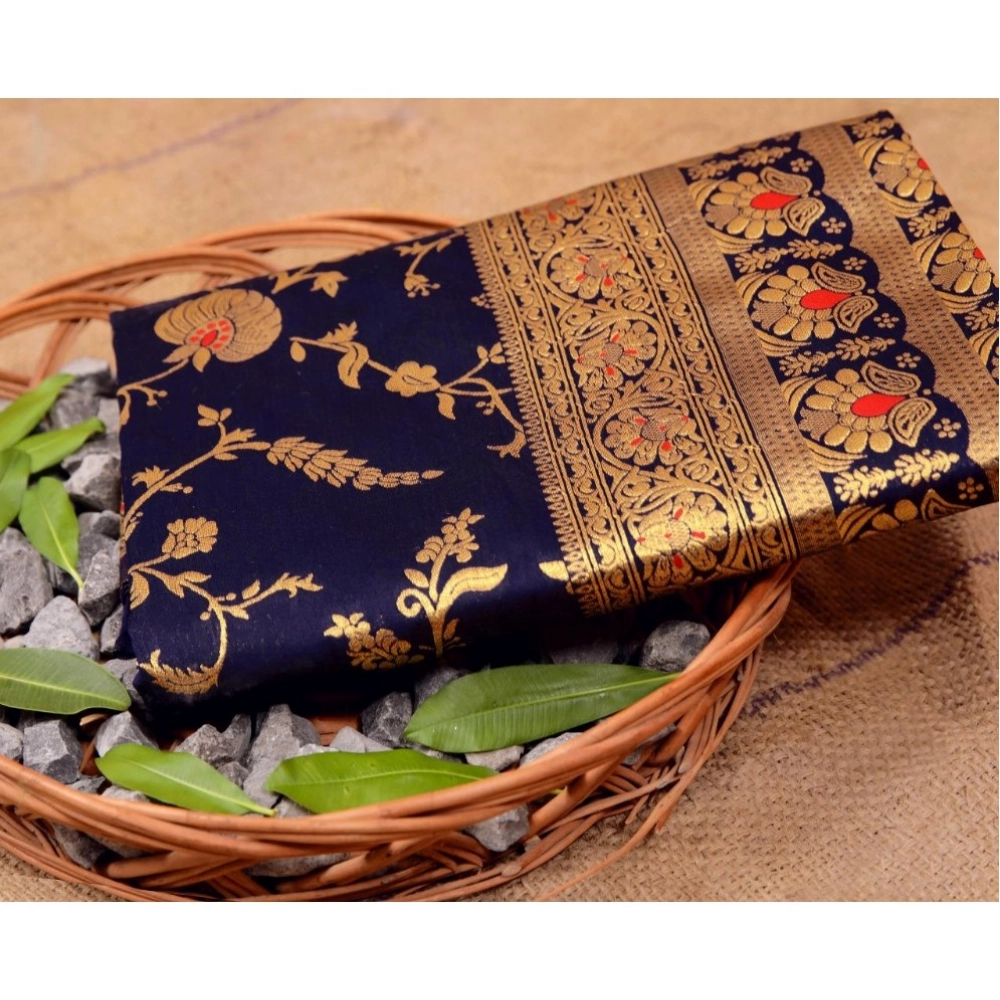Women’s Soft Litchi Silk Jacquard Work Saree With Unstitched Blouse 5.5Mtr (Blue)